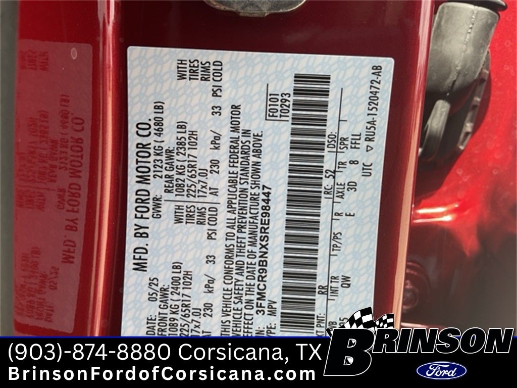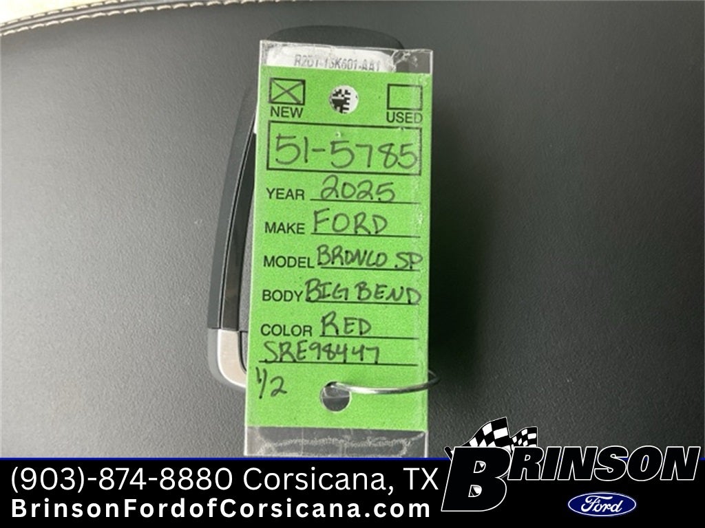 Priced below KBB Fair Purchase Price! Ruby Red Metallic Tinted Clearcoat 2025 Ford Bronco Sport Big Bend 1.5L EcoBoost 4WD 4D Sport Utility 8-Speed Automatic 110V/400W AC Power Outlet, 2nd Row Carpeted Seatback, Auxiliary Switches & Wiring, Black Diamond Off-Road Package, Brush Guard, Cargo Management System (Shelf/Divider/Table), Cargo Mat, Class II Trailer Tow Pack w/Trailer Sway Control, Convenience Package, Fender Tie Downs, Front & Rear Black Bumpers, Front Driver/Passenger Seat Back Map Pockets, Heated 8-Way Power Driver's Seat, Interior Grab Handle, LED Fog Lamps, Premium Wrapped Steering Wheel, Recovery Hooks, Universal Garage Door Opener (UGDO), Wheels: 17 Carbonized Gray Painted Aluminum.