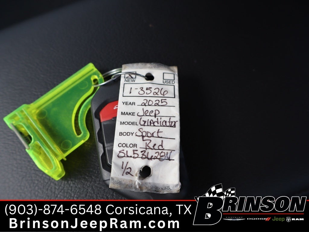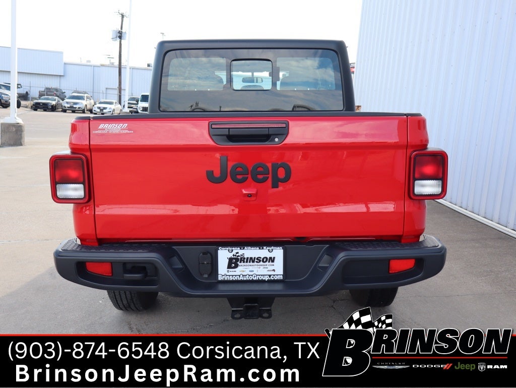 See Brinson Chrysler Dodge Jeep RAM for more details. Price includes:$2000 - 2025 National Select Inventory Bonus Cash w/ 3FV . Exp. 02/02/2026 $2250 - 2025 National Retail Bonus Cash . Exp. 02/02/2026 $9,558 off MSRP! Priced below KBB Fair Purchase Price! Firecracker Red Clearcoat 2025 Jeep Gladiator 4D Crew Cab Sport 4WD 8-Speed Automatic 3.6L V6 24V VVT Gladiator Sport, 4D Crew Cab, 3.6L V6 24V VVT, 8-Speed Automatic, 4WD, Firecracker Red Clearcoat, Black Cloth. Quick Order Package 24B Sport, Trailer Tow & Aux Switch Group (Auxiliary Switches, Class IV Receiver Hitch, Heavy-Duty Engine Cooling, and Trailer Hitch Zoom), Gladiator Sport, 4D Crew Cab, 3.6L V6 24V VVT, 8-Speed Automatic, 4WD, Firecracker Red Clearcoat, Black Cloth, 110 MPH Vehicle Max Speed Calibration, 12.3 Touchscreen Display, 3.73 Rear Axle Ratio, 4-Wheel Disc Brakes, 4G LTE Wi-Fi Hot Spot, 8 Speakers, ABS brakes, Air Conditioning, Alexa Built-In, AM/FM radio: SiriusXM, Apple CarPlay, Apple CarPlay/Android Auto, Black 3-Piece Hard Top, Brake assist, Cloth Low-Back Bucket Seats, Compass, Connectivity - US/Canada, Delay-off headlights, Driver door bin, Driver vanity mirror, Dual front impact airbags, Dual front side impact airbags, Electronic Stability Control, Freedom Panel Storage Bag, Front anti-roll bar, Front Bucket Seats, Front Center Armrest w/Storage, Front fog lights, Front License Plate Bracket, Front reading lights, Google Android Auto, Illuminated entry, Integrated roll-over protection, Low tire pressure warning, MOPAR All-Weather Slush Mats, MOPAR Spray In Bedliner, Normal Duty Suspension, Occupant sensing airbag, Outside temperature display, Overhead airbag, Panic alarm, ParkView Rear Back-Up Camera, Passenger door bin, Passenger vanity mirror, Power steering, Power windows, Radio data system, Radio: Uconnect 5 w/12.3 Display, Rear anti-roll bar, Rear reading lights, Rear Sliding Window, Rear Window Defroster, Remote keyless entry, Speed control, Split folding rear seat, Steering wheel mounted audio controls, Tachometer, Telescoping steering wheel, Tilt steering wheel, Traction control, Trip computer, USB Host Flip, Variably intermittent wipers, Voltmeter, and Wheels: 17 x 7.5 Black Steel Styled.