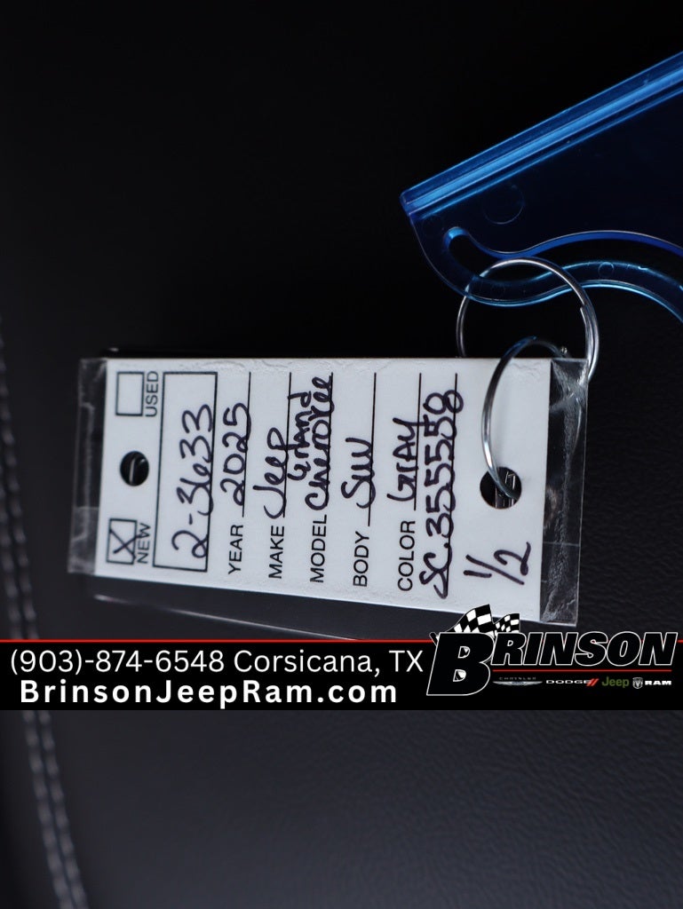 See Brinson Chrysler Dodge Jeep RAM for more details. Price includes:$1000 - 2025 Southwest BC Retail Bonus Cash . Exp. 02/02/2026 $2000 - 2025 National Select Inventory Bonus Cash w/ 3FV . Exp. 02/02/2026 $2250 - 2025 National Retail Bonus Cash . Exp. 02/02/2026 $8,983 off MSRP! Priced below KBB Fair Purchase Price! Baltic Gray Metallic Clearcoat 2025 Jeep Grand Cherokee 4D Sport Utility Altitude X RWD 8-Speed Automatic 3.6L V6 24V VVT Quick Order Package 23M Altitude X (115V Auxiliary Power Outlet, Altitude X, Black Headliner, Capri Leatherette/Suede Seats, Delete Laredo Badge, Gloss Black Exterior Accents, Heated Front Seats, Heated Steering Wheel, Power Liftgate, Power Sunroof, Rain Sensitive Windshield Wipers, Remote Start System, Selectable Tire Fill Alert, Wheels: 18 x 8 Fully Painted Aluminum 1, and Wireless Charging Pad), 4-Wheel Disc Brakes, 6 Speakers, ABS brakes, Air Conditioning, Alloy wheels, AM/FM radio: SiriusXM, Anti-whiplash front head restraints, Automatic temperature control, Brake assist, Bumpers: body-color, Cloth Seats, Compass, Delay-off headlights, Driver door bin, Driver vanity mirror, Dual front impact airbags, Dual front side impact airbags, Electronic Stability Control, Emergency communication system, Four wheel independent suspension, Front anti-roll bar, Front Bucket Seats, Front Center Armrest w/Storage, Front dual zone A/C, Front License Plate Bracket, Front reading lights, Fully automatic headlights, Heated door mirrors, Illuminated entry, Knee airbag, Low tire pressure warning, Model Year Tracking, Normal Duty Suspension, Occupant sensing airbag, Outside temperature display, Overhead airbag, Overhead console, Panic alarm, ParkView Rear Back-Up Camera, Passenger door bin, Passenger vanity mirror, Power door mirrors, Power driver seat, Power steering, Power windows, Radio data system, Rear anti-roll bar, Rear reading lights, Rear window defroster, Rear window wiper, Remote keyless entry, Security system, Speed control, Speed-Sensitive Wipers, Split folding rear seat, Spoiler, Steering wheel mounted audio controls, Tachometer, Telescoping steering wheel, Tilt steering wheel, Traction control, Trip computer, Variably intermittent wipers, Voltmeter, and Wheels: 17 x 6.5 Fully Painted Aluminum.