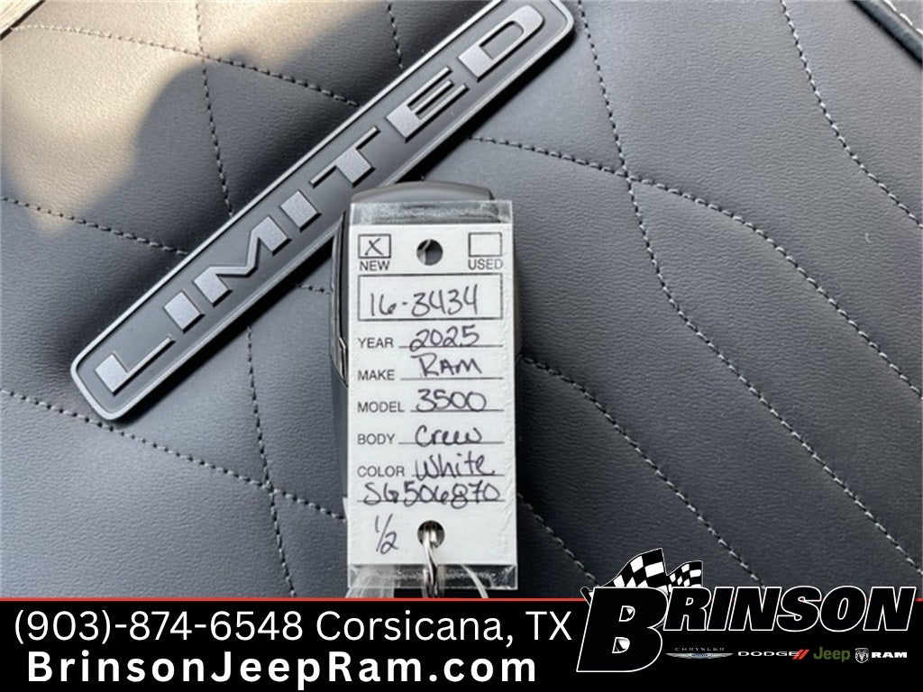 See Brinson Chrysler Dodge Jeep RAM for more details. Price includes:$2000 - 2025 National Bonus Cash . Exp. 02/02/2026 $17,433 off MSRP! Priced below KBB Fair Purchase Price! Bright White Clearcoat 2025 Ram 3500 4D Crew Cab Limited RWD 8-Speed Automatic 6.7L I6 **LEATHER HEATED & COOLED SEATS**, **CLEAN CARFAX**, **NEW TIRES**, **ADAPTIVE CRUISE**, **LANE ASSIST**, **BACK-UP CAMERA**, **BED LINER**, **SUNROOF**, **APPLE CAR PLAY/ANDROID AUTO**, **SIRIUS XM SATELITE RADIO**, **DIESEL**, 3500 Limited, 4D Crew Cab, 6.7L I6, 8-Speed Automatic, RWD, Bright White Clearcoat, Black Leather, 6000# Front Axle w/Hub Ext, ABS brakes, Active Lane Management System, Adaptive Steering System, Black Exterior Truck Badging, Black Limited Grille, Body Color Grille Surround, Box & Rear Fender Clearance Lamps, Bumpers: body-color, Clearance Lamps, Compass, CTR Stop Lamp w/Cargo View Camera, Digital Rearview Mirror, Drowsy Driver Detection, Dual Rear Wheels, Electronic Stability Control, Front dual zone A/C, Heated door mirrors, Heated Front Seats, Heated front seats, Heated rear seats, Heated Second Row Seats, Illuminated entry, LED Bed Lighting, Limited Level 1 Equipment Group, Low tire pressure warning, MOPAR Spray In Bedliner, Navigation System, Night Edition, ParkView Rear Back-Up Camera, Power Deployable Running Boards, Power Sunroof, Quick Order Package 24M Limited, Radio: Uconnect 5 Nav w/14.4 Display, Remote keyless entry, Sport Performance Hood, Surround View Camera System, Traction control, Traffic Sign Recognition, Trailer Reverse Guidance, Trailer Tire Pressure Monitoring System, Wheels: 17 x 6.0 Black Machined Aluminum DRW. Limited Level 1 Equipment Group (Active Lane Management System, Adaptive Steering System, CTR Stop Lamp w/Cargo View Camera, Digital Rearview Mirror, Drowsy Driver Detection, LED Bed Lighting, MOPAR Spray In Bedliner, Power Deployable Running Boards, Surround View Camera System, Traffic Sign Recognition, Trailer Reverse Guidance, and Trailer Tire Pressure Monitoring System), Night Edition (Black Exterior Truck Badging, Black Limited Grille, Body Color Grille Surround, and Sport Performance Hood), Quick Order Package 24M Limited, 3500 Limited, 4D Crew Cab, 6.7L I6, 8-Speed Automatic, RWD, Bright White Clearcoat, Black Leather, 6000# Front Axle w/Hub Ext, ABS brakes, Box & Rear Fender Clearance Lamps, Bumpers: body-color, Clearance Lamps, Compass, Dual Rear Wheels, Electronic Stability Control, Front dual zone A/C, Heated door mirrors, Heated Front Seats, Heated front seats, Heated rear seats, Heated Second Row Seats, Illuminated entry, Low tire pressure warning, Navigation System, ParkView Rear Back-Up Camera, Power Sunroof, Radio: Uconnect 5 Nav w/14.4 Display, Remote keyless entry, Traction control, Wheels: 17 x 6.0 Black Machined Aluminum DRW, 115V Auxiliary Rear Power Outlet, 17 Speakers, 2 Way Rear Headrest Seat, 3.73 Axle Ratio, 4 Way Front Headrests, 4-Wheel Disc Brakes, Adjustable pedals, Air Conditioning, AM/FM radio: SiriusXM with 360L, Apple CarPlay/Android Auto, Audio memory, Auto High-beam Headlights, Auto-dimming door mirrors, Auto-dimming Rear-View mirror, Automatic temperature control, Bodyside moldings, Brake assist, Bucket Seats, Delay-off headlights, Driver door bin, Driver vanity mirror, Dual front impact airbags, Dual front side impact airbags, Dual Wireless Charging Pad, Folding Flat Load Floor Storage, Front anti-roll bar, Front Bucket Seats, Front Center Armrest w/Storage, Front fog lights, Front reading lights, Front Seat Back Map Pockets, Full Length Premium Upgraded Floor Console, Fully automatic headlights, Garage door transmitter, Genuine wood console insert, Genuine wood dashboard insert, Genuine wood door panel insert, harman/kardon® Speakers, Heated Steering Wheel, Heated steering wheel, High Back Seats, Leather steering wheel, Memory seat, Occupant sensing airbag, Outside temperature display, Overhead airbag, Overhead console, Panic alarm, Passenger door bin, Passenger va