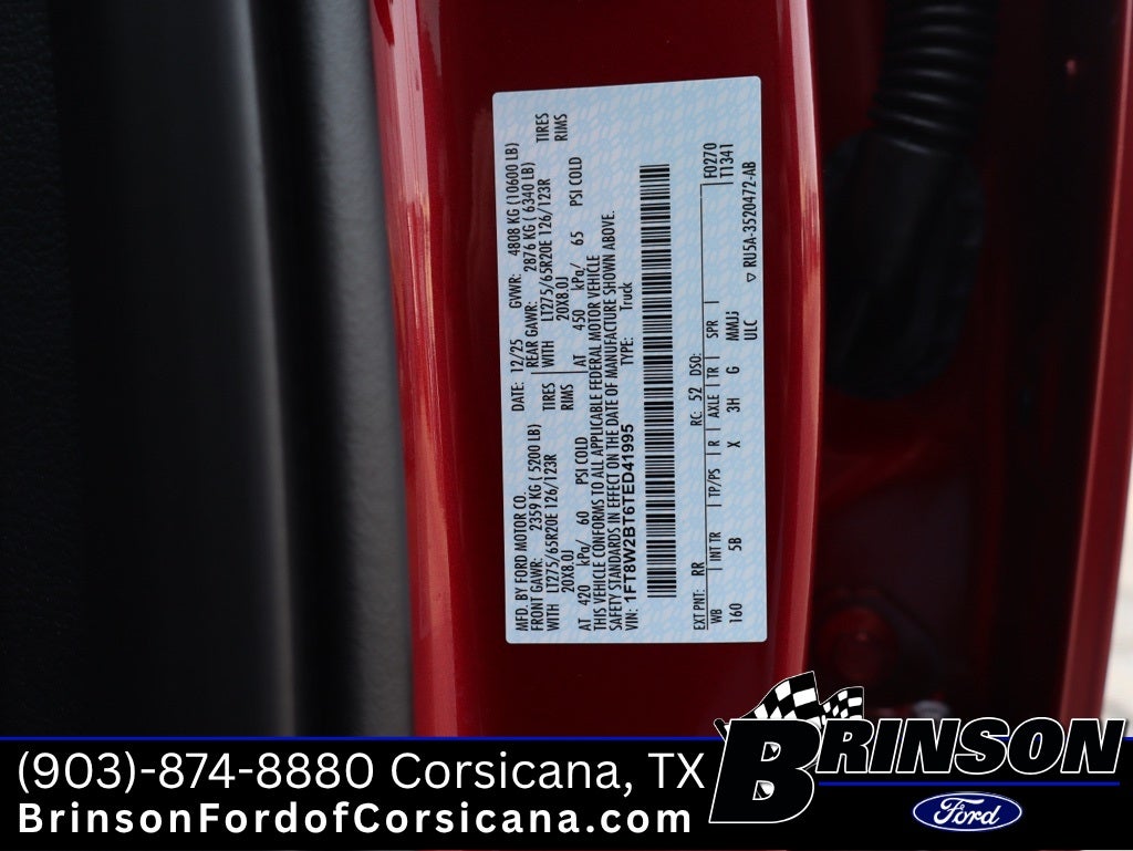 Ruby Red Metallic Tinted Clearcoat 2026 Ford F-250SD Lariat Power Stroke 6.7L V8 DI 32V OHV Turbodiesel 4WD 4D Crew Cab 10-Speed Automatic 4WD, ABS brakes, Alloy wheels, Compass, Electronic Stability Control, Front dual zone A/C, Heated door mirrors, Heated front seats, Heated rear seats, Illuminated entry, Low tire pressure warning, Remote keyless entry, Traction control.