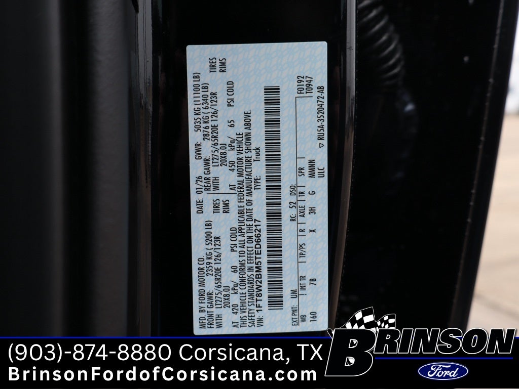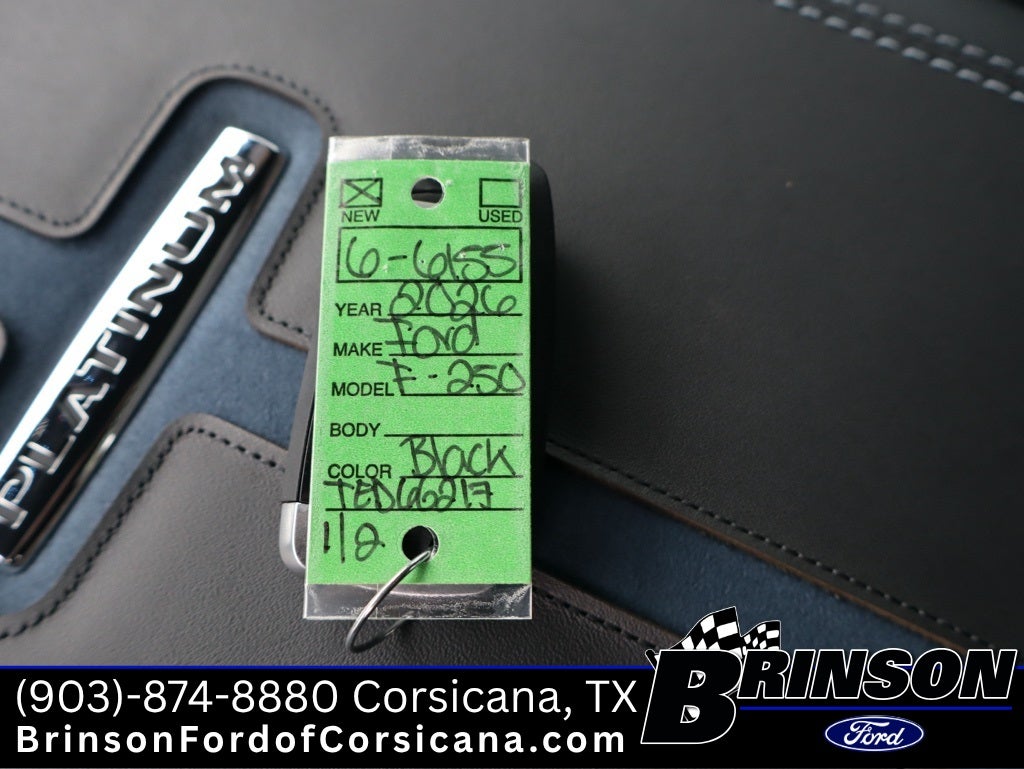 Agate Black Metallic 2026 Ford F-250SD Platinum 6.7L High Output Power Stroke V8 Diesel 4WD 4D Crew Cab 10-Speed Automatic 4WD, ABS brakes, Alloy wheels, Compass, Electronic Stability Control, Front dual zone A/C, Heated door mirrors, Heated front seats, Heated rear seats, Illuminated entry, Low tire pressure warning, Remote keyless entry, Traction control.