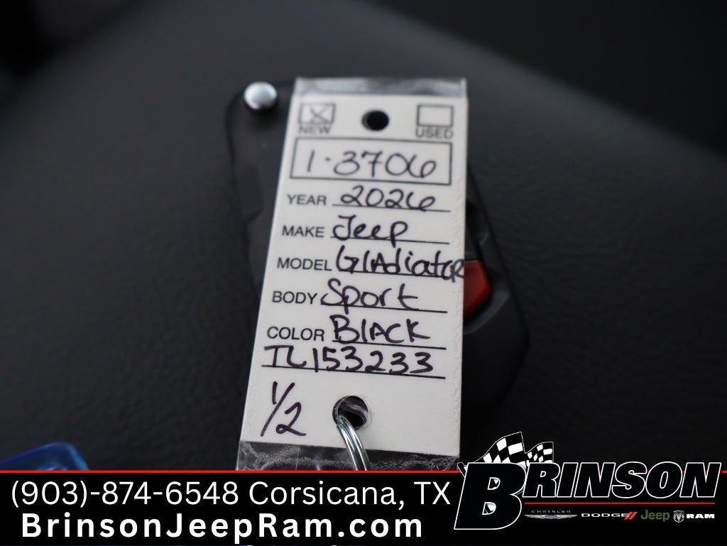 $3,168 off MSRP! Black Clearcoat 2026 Jeep Gladiator 4D Crew Cab Willys 4WD 8-Speed Automatic 3.6L V6 24V VVT ABS brakes, Compass, Electronic Stability Control, Illuminated entry, Low tire pressure warning, ParkView Rear Back-Up Camera, Remote keyless entry, Traction control. ABS brakes, Compass, Electronic Stability Control, Illuminated entry, Low tire pressure warning, ParkView Rear Back-Up Camera, Remote keyless entry, Traction control, 3.73 Rear Axle Ratio, 4-Wheel Disc Brakes, 8 Speakers, Air Conditioning, AM/FM radio: SiriusXM with 360L, Apple CarPlay/Android Auto, Brake assist, Cloth Low-Back Bucket Seats, Delay-off headlights, Driver door bin, Driver vanity mirror, Dual front impact airbags, Dual front side impact airbags, Front anti-roll bar, Front Bucket Seats, Front Center Armrest w/Storage, Front fog lights, Front reading lights, Integrated roll-over protection, Normal Duty Suspension, Occupant sensing airbag, Outside temperature display, Overhead airbag, Panic alarm, Passenger door bin, Passenger vanity mirror, Power steering, Power windows, Radio data system, Rear anti-roll bar, Rear reading lights, Speed control, Split folding rear seat, Steering wheel mounted audio controls, Tachometer, Telescoping steering wheel, Tilt steering wheel, Trip computer, Variably intermittent wipers, Voltmeter, and Wheels: 17 x 7.5 Black Steel Styled.