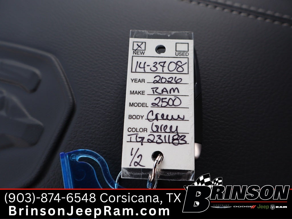 See Brinson Chrysler Dodge Jeep RAM for more details. Price includes:$1000 - 2026 National Bonus Cash . Exp. 02/02/2026 $9,228 off MSRP! Ceramic Gray Clearcoat 2026 Ram 2500 4D Crew Cab Laramie 4WD 8-Speed Automatic 6.7L I6 Laramie Level 1 Plus Equipment Group (#1 Seat Foam Cushion, 115V Auxiliary Rear Power Outlet, 2 Way Rear Headrest Seat, 4 Way Front Headrests, Active Lane Management System, Adaptive Steering System, Anti-Spin Differential Rear Axle, Auto Dim Exterior Mirror, Auto High Beam Headlamp Control, Auto Power-Folding Mirrors, Auto-Dimming Exterior Passenger Mirror, Bucket Seats, Chrome Exterior Mirrors, Drowsy Driver Detection, Dual Wireless Charging Pad, Exterior Mirrors Courtesy Lamps, Folding Flat Load Floor Storage, Front Seat Back Map Pockets, Full Length Upgraded Floor Console, Heated Front Seats, Heated Steering Wheel, High Back Seats, Leather Trimmed Bucket Seats, LED Bed Lighting, Mirror Running Lights, MOPAR Deployable Bed Step, Power 2-Way Driver Lumbar Adjust, Power 2-Way Passenger Lumbar Adjust, Power Adjust 8-Way Driver Seat, Power Adjust 8-Way Front Passenger Seat, Power Adjust Mirrors, Power Telescoping Mirrors, Power-Adjustable Convex Aux Mirrors, Radio/Driver Seat/Mirrors/Pedals Memory, Rain Sensitive Windshield Wipers, Rear 60/40 Folding Seat, Remote Tailgate Release, Traffic Sign Recognition, and Ventilated Front Seats), Night Edition (Black Exterior Mirrors, Black Exterior Truck Badging, Black Wheel Center Hub, Body Color Grille-Surround, Gloss Black Grille Billets/Accents, Sport Performance Hood, and Wheels: 20 x 8.0 Black Painted Aluminum), Quick Order Package 24H Laramie, 10 Speakers, 4-Wheel Disc Brakes, 4G LTE Wi-Fi Hot Spot, ABS brakes, Air Conditioning, Alloy wheels, AM/FM radio: SiriusXM with 360L, Apple CarPlay, Apple CarPlay/Android Auto, Auto-dimming Rear-View mirror, Automatic temperature control, Brake assist, Bumpers: body-color, Compass, Connectivity - US/Canada, Dash Pass Thru Wire Circuits, Delay-off headlights, Disassociated Touchscreen Display, Driver door bin, Driver vanity mirror, Dual front impact airbags, Dual front side impact airbags, Electronic Stability Control, Emergency Vehicle Alert System (EVAS), Engine Block Heater, For Details, Visit DriveUconnect.com, For More Info, Call 800-643-2112, Front anti-roll bar, Front Center Armrest w/Storage, Front dual zone A/C, Front fog lights, Front License Plate Bracket, Front reading lights, Fully automatic headlights, Garage door transmitter, Google Android Auto, GPS Antenna Input, GPS Navigation, HD Radio, Heated door mirrors, Heated front seats, Heated Second Row Seats, Heated steering wheel, Illuminated entry, Leather Trim 40/20/40 Bench Seat, Low tire pressure warning, Manufacturer's Statement of Origin, Navigation System, Occupant sensing airbag, Off-Road Info Pages, Outside temperature display, Overhead airbag, Overhead console, Painted Flat Wheel-to-Wheel Side Steps, Panic alarm, ParkView Rear Back-Up Camera, Passenger door bin, Passenger vanity mirror, Power door mirrors, Power driver seat, Power passenger seat, Power steering, Power windows, Radio data system, Rear anti-roll bar, Rear reading lights, Rear seat center armrest, Rear step bumper, Rear window defroster, Remote keyless entry, Security system, Selectable Tire Fill Alert, SiriusXM Radio Service, Speed control, Split folding rear seat, Steering wheel mounted audio controls, Tachometer, Tilt steering wheel, Traction control, Trailer Tow Pages, Trip computer, Turn signal indicator mirrors, Variably intermittent wipers, and VoltmeteR.