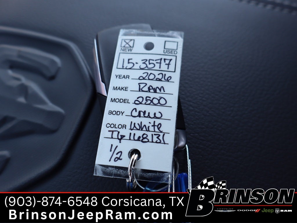 See Brinson Chrysler Dodge Jeep RAM for more details. Price includes:$1000 - 2026 National Bonus Cash . Exp. 02/02/2026 $10,963 off MSRP! Priced below KBB Fair Purchase Price! Bright White Clearcoat 2026 Ram 2500 4D Crew Cab Laramie 4WD 8-Speed Automatic 6.7L I6 Laramie Level 1 Plus Equipment Group (#1 Seat Foam Cushion, 115V Auxiliary Rear Power Outlet, 2 Way Rear Headrest Seat, 4 Way Front Headrests, Active Lane Management System, Adaptive Steering System, Anti-Spin Differential Rear Axle, Auto Dim Exterior Mirror, Auto High Beam Headlamp Control, Auto Power-Folding Mirrors, Auto-Dimming Exterior Passenger Mirror, Bucket Seats, Chrome Exterior Mirrors, Drowsy Driver Detection, Dual Wireless Charging Pad, Exterior Mirrors Courtesy Lamps, Folding Flat Load Floor Storage, Front Seat Back Map Pockets, Full Length Upgraded Floor Console, Heated Front Seats, Heated Steering Wheel, High Back Seats, Leather Trimmed Bucket Seats, LED Bed Lighting, Mirror Running Lights, MOPAR Deployable Bed Step, Power 2-Way Driver Lumbar Adjust, Power 2-Way Passenger Lumbar Adjust, Power Adjust 8-Way Driver Seat, Power Adjust 8-Way Front Passenger Seat, Power Adjust Mirrors, Power Telescoping Mirrors, Power-Adjustable Convex Aux Mirrors, Radio/Driver Seat/Mirrors/Pedals Memory, Rain Sensitive Windshield Wipers, Rear 60/40 Folding Seat, Remote Tailgate Release, Traffic Sign Recognition, and Ventilated Front Seats), Night Edition (Black Exterior Mirrors, Black Exterior Truck Badging, Black Wheel Center Hub, Body Color Grille-Surround, Gloss Black Grille Billets/Accents, Sport Performance Hood, and Wheels: 20 x 8.0 Black Painted Aluminum), Quick Order Package 24H Laramie, Towing Technology Group (Surround View Camera System, Trailer Reverse Guidance, and Trailer Tire Pressure Monitoring System), 10 Speakers, 4-Wheel Disc Brakes, 4G LTE Wi-Fi Hot Spot, ABS brakes, Air Conditioning, Alloy wheels, AM/FM radio: SiriusXM with 360L, Apple CarPlay, Apple CarPlay/Android Auto, Auto-dimming Rear-View mirror, Automatic temperature control, Brake assist, Bumpers: body-color, Compass, Connectivity - US/Canada, Dash Pass Thru Wire Circuits, Delay-off headlights, Disassociated Touchscreen Display, Driver door bin, Driver vanity mirror, Dual front impact airbags, Dual front side impact airbags, Electronic Stability Control, Emergency Vehicle Alert System (EVAS), Engine Block Heater, For Details, Visit DriveUconnect.com, For More Info, Call 800-643-2112, Front anti-roll bar, Front Center Armrest w/Storage, Front dual zone A/C, Front fog lights, Front License Plate Bracket, Front reading lights, Fully automatic headlights, Garage door transmitter, Google Android Auto, GPS Antenna Input, GPS Navigation, HD Radio, Heated door mirrors, Heated front seats, Heated Second Row Seats, Heated steering wheel, Illuminated entry, Leather Trim 40/20/40 Bench Seat, Low tire pressure warning, Manufacturer's Statement of Origin, MyFlexCare Service Diesel, Navigation System, Occupant sensing airbag, Off-Road Info Pages, Outside temperature display, Overhead airbag, Overhead console, Panic alarm, ParkView Rear Back-Up Camera, Passenger door bin, Passenger vanity mirror, Power door mirrors, Power driver seat, Power passenger seat, Power steering, Power windows, Radio data system, Rear anti-roll bar, Rear reading lights, Rear seat center armrest, Rear step bumper, Rear window defroster, Remote keyless entry, Security system, Selectable Tire Fill Alert, SiriusXM Radio Service, Speed control, Split folding rear seat, Steering wheel mounted audio controls, Tachometer, Tilt steering wheel, Traction control, Trailer Tow Pages, Trip computer, Turn signal indicator mirrors, Variably intermittent wipers, and VoltmeteR.