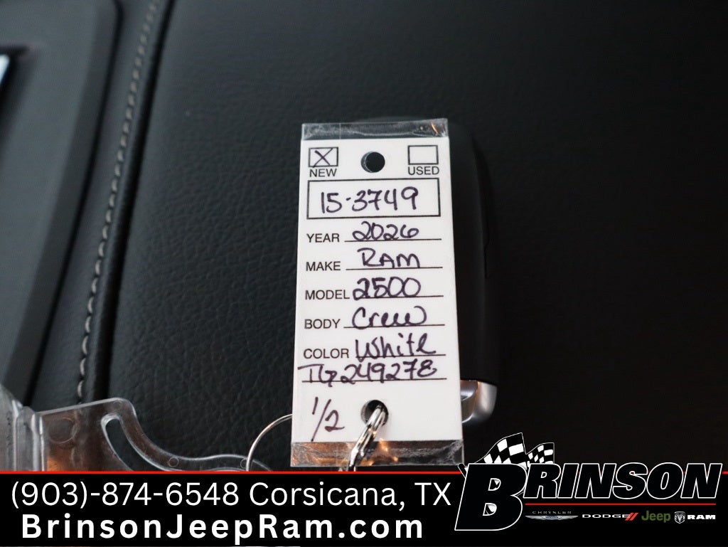 See Brinson Chrysler Dodge Jeep RAM for more details. Price includes:$1000 - 2026 National Bonus Cash . Exp. 02/02/2026 $5,985 off MSRP! Bright White Clearcoat 2026 Ram 2500 4D Crew Cab Tradesman 4WD 8-Speed Automatic 6.7L I6 Quick Order Package 24A Tradesman, Tradesman Level 2 Equipment Group (115-Volt Auxiliary Front Power Outlet, 12 Touchscreen Display, 2 Way Rear Headrest Seat, 4 Way Front Headrests, 40/20/40 Split Bench Seat, 400W Inverter, 4G LTE Wi-Fi Hot Spot, Air Conditioning ATC with Dual Zone Control, Alexa Built-in, Anti-Spin Differential Rear Axle, Apple CarPlay, Auto-Dimming Rear-View Mirror, Black Exterior Mirrors, Bright Front Bumper, Bright Rear Bumper, Carpet Floor Covering, Center Hub, Chrome Grille Surround, Cloth 40/20/40 Bench Seat, Connected Travel and Traffic Services, Connectivity - US/Canada, Disassociated Touchscreen Display, Emergency Vehicle Alert System (EVAS), Exterior 115V AC Outlet, Exterior Mirrors Courtesy Lamps, Exterior Mirrors with Heating Element, Exterior Mirrors with Supplemental Signals, For Details, Visit DriveUconnect.com, For More Info, Call 800-643-2112, Front and Rear Floor Mats, Front Armrest with Cupholders, Global Telematics Box Module, Google Android Auto, GPS Antenna Input, GPS Navigation, HD Radio, Integrated Voice Command with Bluetooth®, Manual Adjust 4-Way Driver Seat, Manual Adjust 4-Way Front Passenger Seat, Manual Folding Exterior Mirrors, Matte Black Mesh Grille with Chrome, Mirror Running Lights, Mopar Black Tubular Side Steps, Off-Road Info Pages, ParkSense Front/Rear Park Assist System, Power Adjust Mirrors, Power Heated Folding Telescope Mirrors, Power-Adjustable Convex Aux Mirrors, Radio: Uconnect 5 Navigation with 12.0 Display, Rear Folding Seat, Rear Power Sliding Window, Remote USB Port - Charge Only, Selectable Tire Fill Alert, SiriusXM Radio Service, SiriusXM with 360L, Storage Tray, Tinted Acoustic Windshield Glass, Trailer Tow Pages, and Wheels: 18 x 8.0 Steel Chrome Clad), 3.73 Axle Ratio, 4-Wheel Disc Brakes, 6 Speakers, ABS brakes, Air Conditioning, AM/FM radio: SiriusXM, Apple CarPlay/Android Auto, Black Wheel Center Hub, Brake assist, Clearance Lamps, Compass, Dash Pass Thru Wire Circuits, Delay-off headlights, Driver door bin, Dual front impact airbags, Dual front side impact airbags, Electronic Stability Control, Engine Block Heater, Front anti-roll bar, Front Center Armrest w/Storage, Front fog lights, Front reading lights, Fully automatic headlights, Illuminated entry, Instrument Panel Mounted Auxiliary Switches, Low tire pressure warning, Manufacturer's Statement of Origin, Occupant sensing airbag, Outside temperature display, Overhead airbag, Overhead console, Panic alarm, ParkView Rear Back-Up Camera, Passenger door bin, Passenger vanity mirror, Power steering, Power windows, Radio data system, Radio: Uconnect 5 with 8.4 Display, Rear anti-roll bar, Rear step bumper, Rear window defroster, Remote keyless entry, Speed control, Tachometer, Tilt steering wheel, Traction control, Variably intermittent wipers, Voltmeter, and Wheels: 17 x 7.5 Black Steel StyleD.