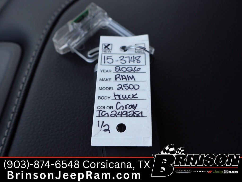 See Brinson Chrysler Dodge Jeep RAM for more details. Price includes:$1000 - 2026 National Bonus Cash . Exp. 02/02/2026 $7,963 off MSRP! Granite Crystal Metallic Clearcoat 2026 Ram 2500 4D Crew Cab Tradesman 4WD 8-Speed Automatic 6.7L I6 Quick Order Package 24A Tradesman, Tradesman Level 2 Equipment Group (115-Volt Auxiliary Front Power Outlet, 12 Touchscreen Display, 2 Way Rear Headrest Seat, 4 Way Front Headrests, 40/20/40 Split Bench Seat, 400W Inverter, 4G LTE Wi-Fi Hot Spot, Air Conditioning ATC with Dual Zone Control, Alexa Built-in, Anti-Spin Differential Rear Axle, Apple CarPlay, Auto-Dimming Rear-View Mirror, Black Exterior Mirrors, Bright Front Bumper, Bright Rear Bumper, Carpet Floor Covering, Center Hub, Chrome Grille Surround, Cloth 40/20/40 Bench Seat, Connected Travel and Traffic Services, Connectivity - US/Canada, Disassociated Touchscreen Display, Emergency Vehicle Alert System (EVAS), Exterior 115V AC Outlet, Exterior Mirrors Courtesy Lamps, Exterior Mirrors with Heating Element, Exterior Mirrors with Supplemental Signals, For Details, Visit DriveUconnect.com, For More Info, Call 800-643-2112, Front and Rear Floor Mats, Front Armrest with Cupholders, Global Telematics Box Module, Google Android Auto, GPS Antenna Input, GPS Navigation, HD Radio, Integrated Voice Command with Bluetooth®, Manual Adjust 4-Way Driver Seat, Manual Adjust 4-Way Front Passenger Seat, Manual Folding Exterior Mirrors, Matte Black Mesh Grille with Chrome, Mirror Running Lights, Mopar Black Tubular Side Steps, Off-Road Info Pages, ParkSense Front/Rear Park Assist System, Power Adjust Mirrors, Power Heated Folding Telescope Mirrors, Power-Adjustable Convex Aux Mirrors, Radio: Uconnect 5 Navigation with 12.0 Display, Rear Folding Seat, Rear Power Sliding Window, Remote USB Port - Charge Only, Selectable Tire Fill Alert, SiriusXM Radio Service, SiriusXM with 360L, Storage Tray, Tinted Acoustic Windshield Glass, Trailer Tow Pages, and Wheels: 18 x 8.0 Steel Chrome Clad), 3.73 Axle Ratio, 4-Wheel Disc Brakes, 6 Speakers, ABS brakes, Air Conditioning, AM/FM radio: SiriusXM, Apple CarPlay/Android Auto, Black Wheel Center Hub, Brake assist, Clearance Lamps, Compass, Dash Pass Thru Wire Circuits, Delay-off headlights, Driver door bin, Dual front impact airbags, Dual front side impact airbags, Electronic Stability Control, Engine Block Heater, Front anti-roll bar, Front Center Armrest w/Storage, Front fog lights, Front reading lights, Fully automatic headlights, Illuminated entry, Instrument Panel Mounted Auxiliary Switches, Low tire pressure warning, Manufacturer's Statement of Origin, Occupant sensing airbag, Outside temperature display, Overhead airbag, Overhead console, Panic alarm, ParkView Rear Back-Up Camera, Passenger door bin, Passenger vanity mirror, Power steering, Power windows, Radio data system, Radio: Uconnect 5 with 8.4 Display, Rear anti-roll bar, Rear step bumper, Rear window defroster, Remote keyless entry, Speed control, Tachometer, Tilt steering wheel, Traction control, Variably intermittent wipers, Voltmeter, and Wheels: 17 x 7.5 Black Steel StyleD.