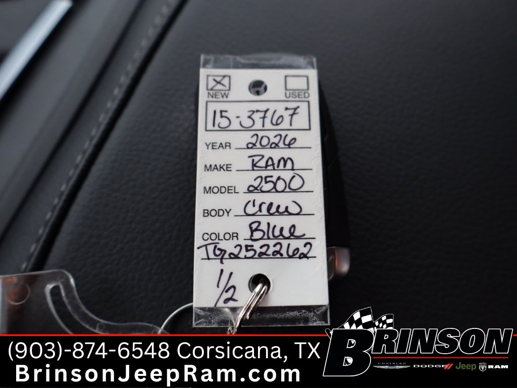 See Brinson Chrysler Dodge Jeep RAM for more details. Price includes:$1000 - 2026 National Bonus Cash . Exp. 02/02/2026 $6,648 off MSRP! Forged Blue Metallic 2026 Ram 2500 4D Crew Cab Tradesman 4WD 8-Speed Automatic 6.4L V8 Quick Order Package 2UA Tradesman, Tradesman Level 2 Equipment Group (115-Volt Auxiliary Front Power Outlet, 12 Touchscreen Display, 2 Way Rear Headrest Seat, 4 Way Front Headrests, 40/20/40 Split Bench Seat, 400W Inverter, 4G LTE Wi-Fi Hot Spot, Air Conditioning ATC with Dual Zone Control, Alexa Built-in, Anti-Spin Differential Rear Axle, Apple CarPlay, Auto-Dimming Rear-View Mirror, Black Exterior Mirrors, Bright Front Bumper, Bright Rear Bumper, Carpet Floor Covering, Center Hub, Chrome Grille Surround, Cloth 40/20/40 Bench Seat, Connected Travel and Traffic Services, Connectivity - US/Canada, Disassociated Touchscreen Display, Emergency Vehicle Alert System (EVAS), Exterior 115V AC Outlet, Exterior Mirrors Courtesy Lamps, Exterior Mirrors with Heating Element, Exterior Mirrors with Supplemental Signals, For Details, Visit DriveUconnect.com, For More Info, Call 800-643-2112, Front and Rear Floor Mats, Front Armrest with Cupholders, Global Telematics Box Module, Google Android Auto, GPS Antenna Input, GPS Navigation, HD Radio, Integrated Voice Command with Bluetooth®, Manual Adjust 4-Way Driver Seat, Manual Adjust 4-Way Front Passenger Seat, Manual Folding Exterior Mirrors, Matte Black Mesh Grille with Chrome, Mirror Running Lights, Mopar Black Tubular Side Steps, Off-Road Info Pages, ParkSense Front/Rear Park Assist System, Power Adjust Mirrors, Power Heated Folding Telescope Mirrors, Power-Adjustable Convex Aux Mirrors, Radio: Uconnect 5 Navigation with 12.0 Display, Rear Folding Seat, Rear Power Sliding Window, Remote USB Port - Charge Only, Selectable Tire Fill Alert, SiriusXM Radio Service, SiriusXM with 360L, Storage Tray, Tinted Acoustic Windshield Glass, Trailer Tow Pages, and Wheels: 18 x 8.0 Steel Chrome Clad), 3.73 Axle Ratio, 4-Wheel Disc Brakes, 6 Speakers, ABS brakes, Air Conditioning, AM/FM radio: SiriusXM, Apple CarPlay/Android Auto, Black Wheel Center Hub, Brake assist, Clearance Lamps, Compass, Dash Pass Thru Wire Circuits, Delay-off headlights, Driver door bin, Dual front impact airbags, Dual front side impact airbags, Electronic Stability Control, Front anti-roll bar, Front Center Armrest w/Storage, Front fog lights, Front License Plate Bracket, Front reading lights, Fully automatic headlights, Illuminated entry, Instrument Panel Mounted Auxiliary Switches, Low tire pressure warning, Manufacturer's Statement of Origin, Occupant sensing airbag, Outside temperature display, Overhead airbag, Overhead console, Panic alarm, ParkView Rear Back-Up Camera, Passenger door bin, Passenger vanity mirror, Power steering, Power windows, Radio data system, Radio: Uconnect 5 with 8.4 Display, Rear anti-roll bar, Rear step bumper, Rear window defroster, Remote keyless entry, Speed control, Tachometer, Tilt steering wheel, Traction control, Variably intermittent wipers, Voltmeter, and Wheels: 17 x 7.5 Black Steel StyleD.