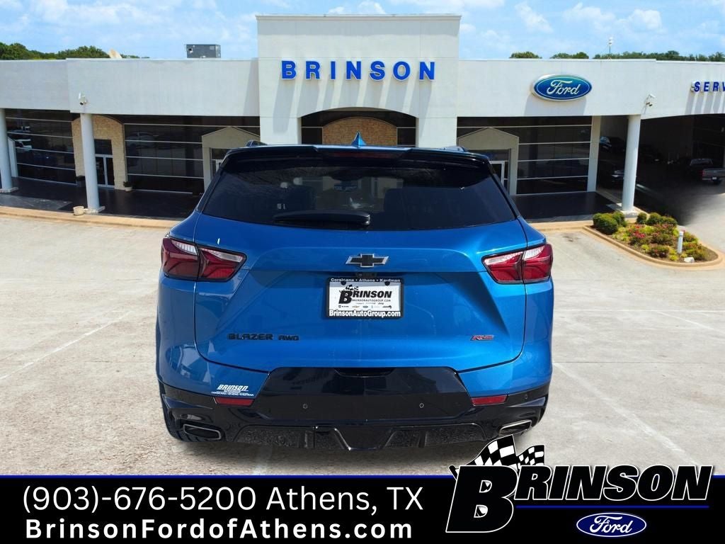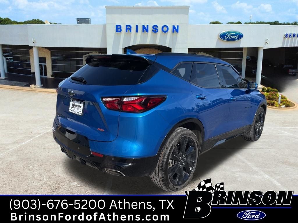The exterior of this Blazer RS exudes a bold, athletic presence with its sleek lines, distinctive grille, and 21-inch gloss black aluminum wheels. The striking Blue Metallic paint further enhances the SUV's visual appeal, making it a true head-turner on the road.