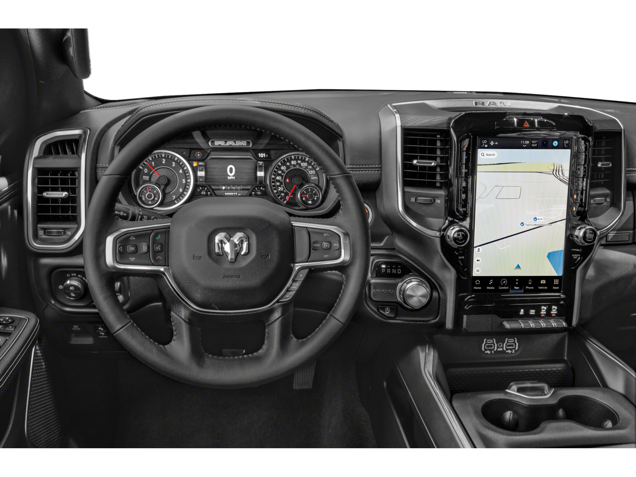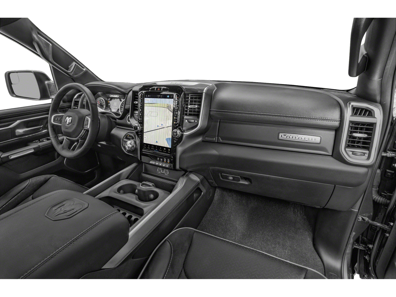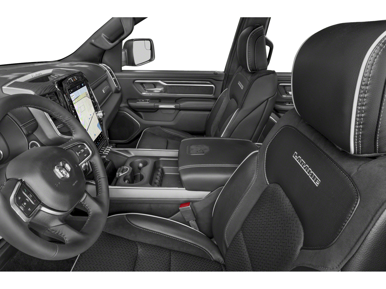 Off Road Group (E-Locker Rear Axle, Front Extra HD Shock Absorbers, Off Road Decals, Raised Ride Height, Rear Extra HD Shock Absorbers, Selec-Speed (TM) Control, and Tow Hooks), Quick Order Package 23H Laramie, #1 Seat Foam Cushion, 10 Speakers, 3 Rear Seat Head Restraints, 3.21 Rear Axle Ratio, 4 Way Front Headrests, 4-Wheel Disc Brakes, 48V Belt Starter Generator, 4G LTE Wi-Fi Hot Spot, ABS brakes, Adjustable pedals, Air Conditioning, Alloy wheels, AM/FM radio: SiriusXM with 360L, Apple CarPlay, Apple CarPlay/Android Auto, Audio memory, Auto-dimming door mirrors, Auto-Dimming Exterior Driver Mirror, Auto-dimming Rear-View mirror, Automatic temperature control, Brake assist, Bumpers: chrome, Chrome Exterior Mirrors, Class IV Receiver Hitch, Compass, Connected Travel & Traffic Services, Connectivity - US/Canada, Convex Wide-Angle Exterior Mirror Insert, Delay-off headlights, Disassociated Touchscreen Display, Driver door bin, Driver Seat Memory, Driver vanity mirror, Dual front impact airbags, Dual front side impact airbags, Electronic Stability Control, Exterior Mirrors Courtesy Lamps, Exterior Mirrors w/Heating Element, Exterior Mirrors w/Memory, Exterior Mirrors w/Supplemental Signals, For Details, Visit DriveUconnect.com, For More Info, Call 800-643-2112, Front anti-roll bar, Front Center Armrest w/Storage, Front dual zone A/C, Front fog lights, Front License Plate Bracket, Front reading lights, Front Seat Back Map Pockets, Front wheel independent suspension, Fully automatic headlights, Garage door transmitter, Global Telematics Box Module (TBM), Google Android Auto, GPS Antenna Input, GPS Navigation, HD Radio, Heated door mirrors, Heated Front Seats, Heated front seats, Heated Steering Wheel, Heated steering wheel, Illuminated entry, Integrated Center Stack Radio, Integrated Voice Command w/Bluetooth®, Leather steering wheel, Leather Trim 40/20/40 Bench Seat, Low tire pressure warning, Manufacturer's Statement of Origin, Memory seat, MOPAR Front & Rear Rubber Floor Mats, Navigation System, Occupant sensing airbag, Outside temperature display, Overhead airbag, Overhead console, Panic alarm, ParkView Rear Back-Up Camera, Passenger door bin, Passenger vanity mirror, Pedal memory, Power 2-Way Driver Lumbar Adjust, Power 2-Way Passenger Lumbar Adjust, Power 8-Way Driver & Passenger Seats, Power door mirrors, Power driver seat, Power passenger seat, Power steering, Power windows, Power-Folding Mirrors, Radio data system, Radio: Uconnect 5 Nav w/8.4 Display, RAM Grille Badge - Chrome, Rear 60/40 Folding Seat, Rear anti-roll bar, Rear seat center armrest, Rear step bumper, Remote keyless entry, Security system, SiriusXM Radio Service, SiriusXM w/360L, Speed control, Split folding rear seat, Steering wheel mounted audio controls, Tachometer, Telescoping steering wheel, Tilt steering wheel, Traction control, Trip computer, Turn signal indicator mirrors, USB Host Flip, Variably intermittent wipers, Ventilated Front Seats, Ventilated front seats, Voltmeter, and Wheels: 18 x 8 Aluminum Base PainteD. Recent Arrival!