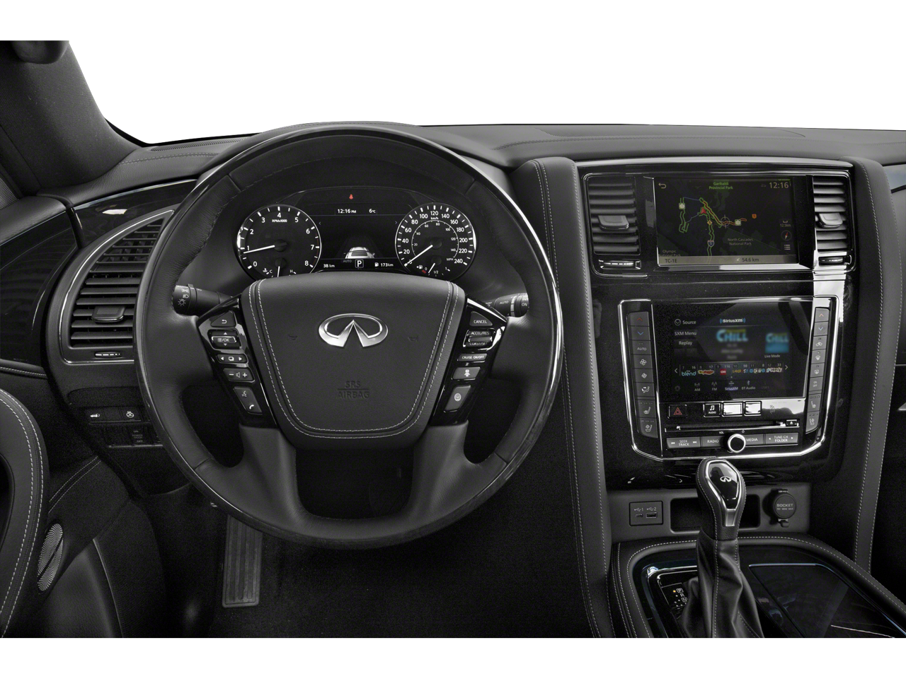 - Radio: Bose Performance Audio System w/17 Speakers -inc: speed-sensitive volume control, INFINITI InTouch 12.3" interactive display, INFINITI InTouch services (1-year premium trial and 5-year select trial), INFINITI navigation w/lane guidance and 3D building graphics, MapCare w/over-the-air update compatibility (5-year trial period), premium traffic w/live traffic information (5-year trial period), TomTom weather (5-year trial period), HD radio technology, Apple CarPlay w/wireless Apple CarPlay integration, Android Auto, Siri Eyes Free, Wi-Fi hotspot (30-day or 1GB trial, whichever comes first), Alexa built-in, SiriusXM radio (3-month trial period), SiriusXM Traffic (3-month trial period), SiriusXM Travel Link (3-month trial period): weather, fuel prices, stock prices, sports scores, movie listings and parking, over-the-air head unit update capability (5-year trial period), INFINITI Voice recognition for audio, navigation, Bluetooth and vehicle information, Bluetooth hands-free phone system and streaming audio, hands-free text messaging assistant, 2x USB ports for compatible devices for audio streaming and wireless phone charger