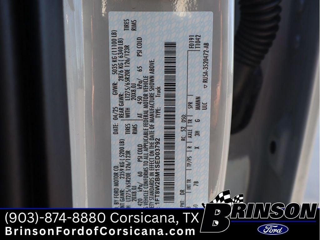 FX4 Off-Road Package: Transfer Case and Fuel Tank Skid Plates; Hill Descent Control; Off-Road Specifically Tuned Shock Absorbers; Unique FX4 Off-Road Box Decal. Order Code 703A: Unique Platinum Leather 40/console/40 Seats; LT275/65Rx20E BSW A/T Tires; B&O Unleashed Sound System by Bang & Olufsen Radio. Twin Panel Power Moonroof. High Capacity 11.6" Axle Upgrade Package. Pro Power Onboard - 2kW. Electronic-Locking with 3.31 Axle Ratio. Rapid-Heat Supplemental Cab Heater. **Equipment listed is based on original vehicle build and subject to change. Please confirm the accuracy of the included equipment by calling the dealer prior to purchase.**