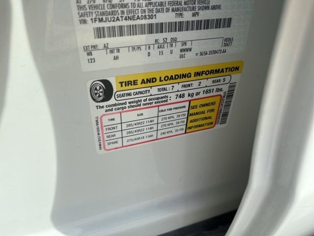 Star White Metallic Tri-Coat 2022 Ford Expedition Limited 4WD 10-Speed Automatic EcoBoost 3.5L V6 GTDi DOHC 24V Twin Turbocharged 4WD. Equipment Group 303A Stealth Package (1st & 2nd Row Floor Mats w/Logo, Panoramic Vista Roof, and Power-Folding Sideview Mirrors w/Autofold), Stealth Edition Package (Black Headlamp and Fog Lamp Bezels, Black Rear Bumper, Black Roof Rack Side Rails, Body Color Door Handles, Ebony Black Power Deployable Running Boards, Ebony Black Tailgate Applique, Ebony Black Twin Spar Grille, Heated/Ventilated Lthr Front Captain's Chairs (A), LED Taillamp w/Black Bezels, Sport-Tuned Suspension, and Wheels: 22 Premium Black-Painted Aluminum), 4WD, 12 Speakers, 15.5 LCD Capacitive Touchscreen, 360-Degree Camera w/Split View, 3rd row seats: split-bench, 4-Wheel Disc Brakes, ABS brakes, Active Park Assist 2.0, Adjustable pedals, Advanced Cargo Manager, Air Conditioning, Alloy wheels, AM/FM radio: SiriusXM with 360L, Auto High-beam Headlights, Auto Start-Stop Removal, Auto-dimming door mirrors, Auto-dimming Rear-View mirror, Automatic temperature control, Brake assist, Bumpers: body-color, Compass, Delay-off headlights, Driver door bin, Driver vanity mirror, Dual front impact airbags, Dual front side impact airbags, Electronic Stability Control, Emergency communication system: SYNC 4 911 Assist, Exterior Parking Camera Rear, Four wheel independent suspension, Front anti-roll bar, Front Bucket Seats, Front Center Armrest, Front dual zone A/C, Front fog lights, Front reading lights, Fully automatic headlights, Garage door transmitter, Heated & Ventilated Leather Front Captain's Chairs, Heated door mirrors, Heated front seats, Heated rear seats, Heated steering wheel, Illuminated entry, Instrument Panel Cluster, Leather steering wheel, Low tire pressure warning, Memory seat, Navigation system: Connected Navigation, Occupant sensing airbag, Outside temperature display, Overhead airbag, Overhead console, Panic alarm, Passenger door bin, Passenger vanity mirror, Pedal memory, Power door mirrors, Power driver seat, Power Liftgate, Power moonroof, Power passenger seat, Power steering, Power windows, Radio data system, Radio: B&O Sound System by Bang & Olufsen, Rain sensing wipers, Rear air conditioning, Rear anti-roll bar, Rear reading lights, Rear window defroster, Rear window wiper, Reclining 3rd row seat, Remote keyless entry, Reverse Brake Assist, Reversible Cargo Mat, Security system, SiriusXM w/360L, Speed control, Speed-sensing steering, Speed-Sensitive Wipers, Split folding rear seat, Spoiler, Steering wheel memory, Steering wheel mounted audio controls, SYNC 4 w/Enhanced Voice Recognition, SYNC 4A w/Enhanced Voice Recognition, Tachometer, Telescoping steering wheel, Tilt steering wheel, Traction control, Trip computer, Turn signal indicator mirrors, Variably intermittent wipers, Ventilated front seats, Voltmeter, and Wheels: 20 Bright Machined Aluminum.