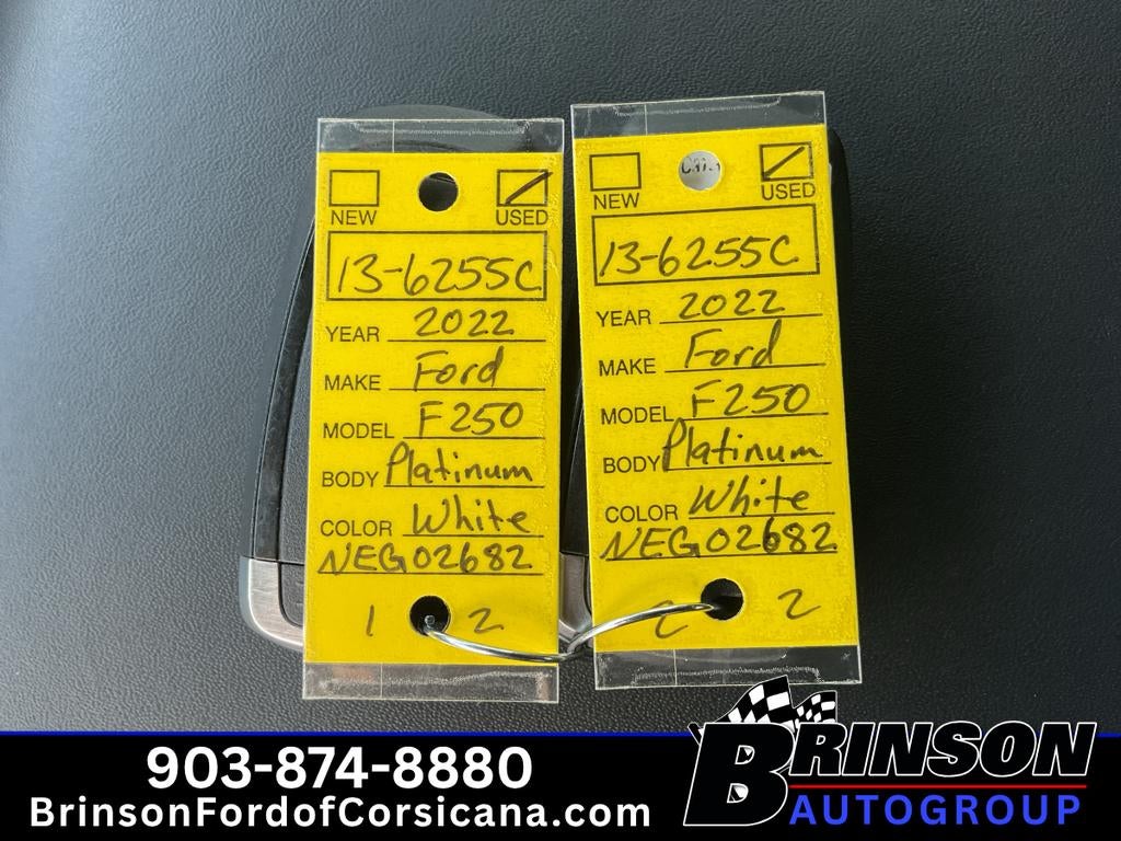 2022 Ford F-250 Super Duty Platinum - a powerful, refined workhorse with only 25,683 miles, now available in Corsicana, TX at the best price. This striking 4WD pickup pairs a legendary V8 6.7L Diesel engine with premium Platinum-level appointments, delivering exceptional towing capability, impressive torque, and long-haul confidence without sacrificing comfort. Inside, premium materials and advanced technology create a commanding yet refined cabin. Built for connectivity and convenience, this Ford F-250 features Apple CarPlay, navigation, and XM Radio for seamless entertainment and route guidance. Stay comfortable in all seasons with a heated steering wheel and heated/cooled seating options, while the Off-Road Package equips this truck to handle rugged terrain and tough jobsite conditions with confidence. This Super Duty's low mileage makes it an outstanding value for buyers seeking a capable diesel truck that still has plenty of life left. You'll appreciate Platinum-level luxuries-advanced safety features, refined interior trim, and thoughtful storage-paired with the durability Ford trucks are known for. Whether you're towing heavy loads, heading off-road, or enjoying highway comfort, this Ford F-250 Platinum delivers performance and style. Located in Corsicana, TX, this 2022 Ford F-250 Super Duty Platinum offers exceptional capability, modern tech, and low miles at the best price in the area. Schedule a test drive today and experience diesel power and Platinum comfort firsthand.