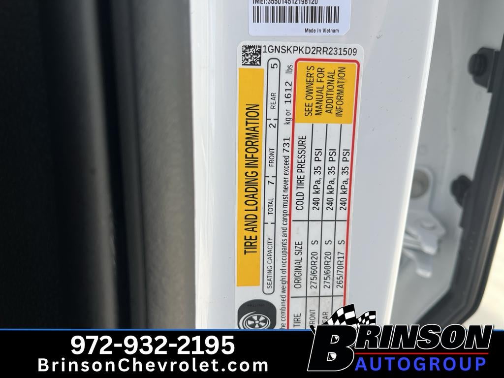 Max Trailering Package: Extra Capacity Cooling System. Advanced Trailering Package: Smart Trailer Integration Indicator; Integrated Trailer Brake Controller; Hitch View with Pan/zoom Image Adjustment. Driver Alert Package: Rear Cross Traffic Alert; Lane Change Alert with Side Blind Zone Alert. Luxury Package: HD Surround Vision; Heated 2nd Row Outboard Seats; 2nd Row Power Release 60/40 Split-Folding Bench Seat; Memory Settings; Power Tilt and Telescopic Steering Column; Rear Pedestrian Alert; Heated Steering Wheel; 3rd Row 60/40 Power-Folding Split-Bench Seat; Outside Heated Power-Adjustable Mirrors. Preferred Equipment Group 2Z7: Bright Front and Rear Door Sill Plates; Leather-Appointed Seat Trim; Remote Start; Hill Descent Control; 20" X 9" Machined Aluminum Wheels; Floor Console with Storage Area; Black Tubular Assist Steps; LED Daytime Running Lamps; Driver and Front Outboard Passenger Airbags; Memory Settings For Driver; Wireless Charging; Front High-Back Reclining Bucket Seats; Universal Home Remote; Color-Keyed Carpeting Floor Covering; Front Skid P