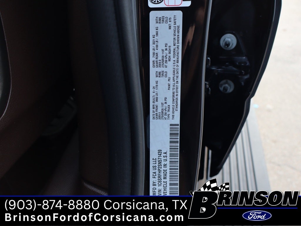 Bed Utility Group (MOPAR 4 Adjustable Cargo Tie-Down Hooks and Truck Bed Cargo Divider), Quick Order Package 22K Longhorn (Grille Surround 4 Chrome Texture 5 Chrome, Longhorn Badge, Longhorn Instrument Cluster Theme 3, Premium Door Trim Panel, Premium Filigree Leather Seats, and Warm Chrome Key Fob), 19 Speakers, 3.92 Rear Axle Ratio, 4-Wheel Disc Brakes, 4G LTE Wi-Fi Hot Spot, ABS brakes, Adjustable pedals, Air Conditioning, Alloy wheels, AM/FM radio: SiriusXM with 360L, Apple CarPlay, Apple CarPlay/Android Auto, Audio memory, Auto High-beam Headlights, Auto Power-Folding Mirrors, Auto-dimming door mirrors, Auto-Dimming Exterior Driver Mirror, Auto-dimming Rear-View mirror, Auto-leveling suspension, Automatic temperature control, Bodyside moldings, Brake assist, Bumpers: chrome, Chrome Exterior Mirrors, Compass, Connected Travel & Traffic Services, Connectivity - US/Canada, Convex Wide-Angle Exterior Mirror Insert, Delay-off headlights, Driver door bin, Driver vanity mirror, Dual front impact airbags, Dual front side impact airbags, Electronic Stability Control, Exterior 115V AC Outlet, Exterior Mirrors Courtesy Lamps, Exterior Mirrors w/Heating Element, Exterior Mirrors w/Memory, Exterior Mirrors w/Supplemental Signals, Front anti-roll bar, Front Bucket Seats, Front Center Armrest w/Storage, Front dual zone A/C, Front fog lights, Front License Plate Bracket, Front reading lights, Front wheel independent suspension, Fully automatic headlights, Garage door transmitter, Genuine wood console insert, Genuine wood dashboard insert, Genuine wood door panel insert, Google Android Auto, GPS Antenna Input, GPS Navigation, harman/kardon® Speakers, HD Radio, Heated door mirrors, Heated front seats, Heated rear seats, Heated steering wheel, Illuminated entry, Integrated Voice Command w/Bluetooth®, Leather steering wheel, Low tire pressure warning, Memory seat, Navigation System, Occupant sensing airbag, Outside temperature display, Overhead airbag, Overhead console, Panic alarm, ParkView Rear Back-Up Camera, Passenger door bin, Passenger vanity mirror, Pedal memory, Power door mirrors, Power driver seat, Power passenger seat, Power steering, Power windows, Premium Quilted Leather Bucket Seats, Radio data system, Radio: Uconnect 5 Nav w/12.0 Display, Rain sensing wipers, Rear anti-roll bar, Rear reading lights, Rear seat center armrest, Rear step bumper, Rear window defroster, Remote keyless entry, Security system, SiriusXM w/360L, Speed control, Split folding rear seat, Steering wheel mounted audio controls, Tachometer, Telescoping steering wheel, Tilt steering wheel, Traction control, Trailer Brake Control, Trip computer, Turn signal indicator mirrors, USB Host Flip, Variably intermittent wipers, Ventilated front seats, Ventilated rear seats, Voltmeter, and Wheels: 20 x 9 Premium Paint/Polished.
